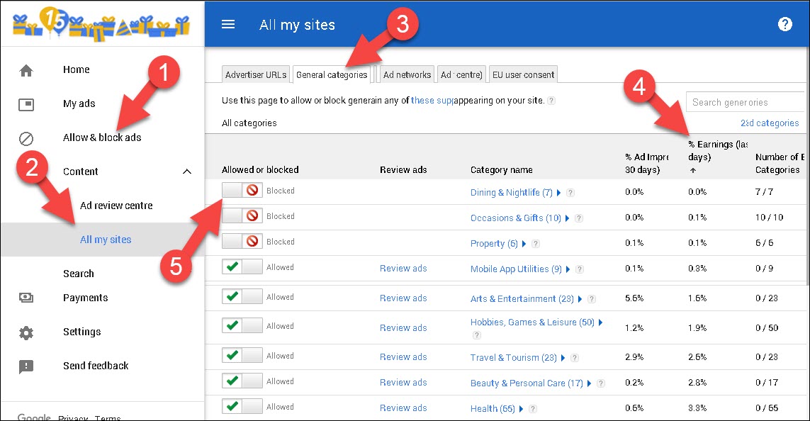 - Ab inn low earning ads ko block karne ke liye. Allowed or blocked ke niche right toggle sign par click karke inhe deselect kar dijiye.