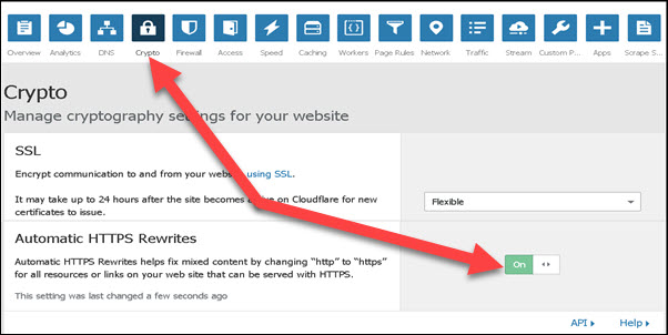Ab wapas apne cloudflare window me jaye aur Crypto option par click kare. Iske baad bottom side me scroll kare. Aur Automatic HTTPS Rewrites ke samne ke button ko On kar dijiye.