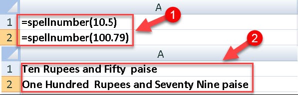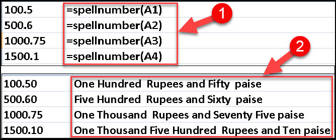 - Microsoft excel spreadsheet me jiss cell me value hai uske samne wali cell me formula key kare. Aap chahe to kisi other column ya cell me bhi ye formula apply kar sakte hai. Formula me =spellnumber(cell add) key kare.