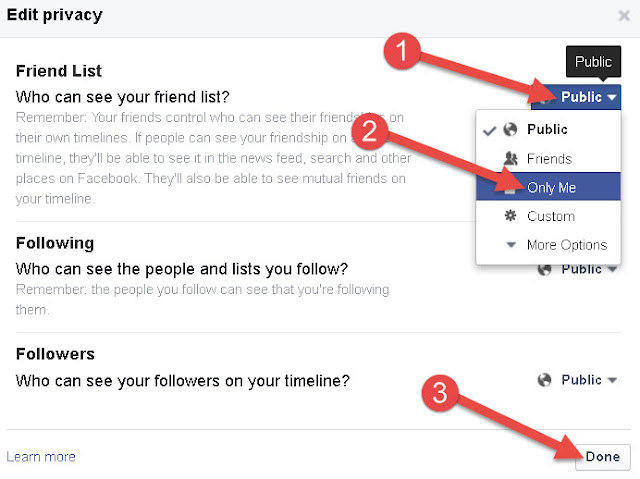 2. Agar friendlist hide karna hai to only me par click kare, baki option bhi chun sakte hai.