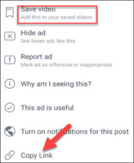 Ab dropdown option open hoga isme aap top side me Save Video ka option dekh sakte hai. But iss option click karne par video facebook me hi save hoga. Aapki mobile gallery me nahi hoga. Mobile gallery me facebook video download karne ke liye bottom side me Copy Link ke option par click kare.
