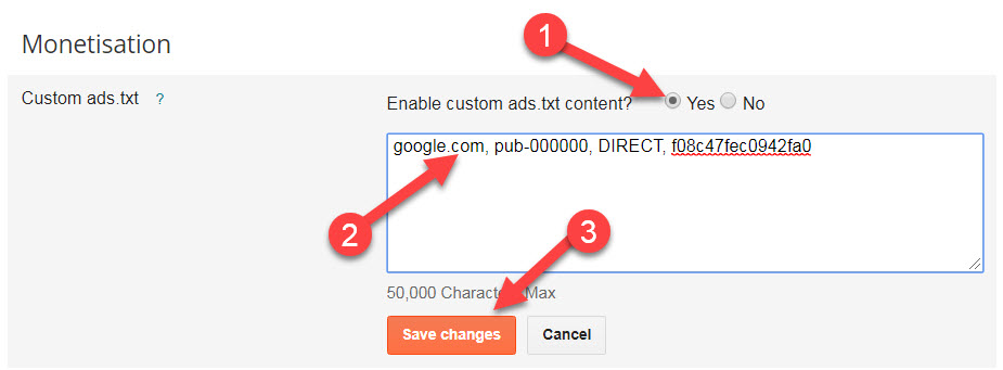 - Enable custom ads txt content ke samne Yes par tick kare.