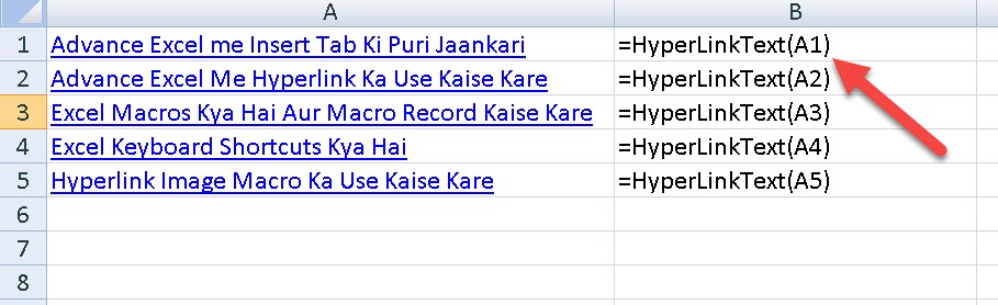 Iske baad wapas apni excel worksheet me jaye aur top hyperlink cell ke agli cell me ye formula [=hyperlinktext(A1] enter kare. Iske baad formula copy kare aur niche ki other cells me paste dijiye.