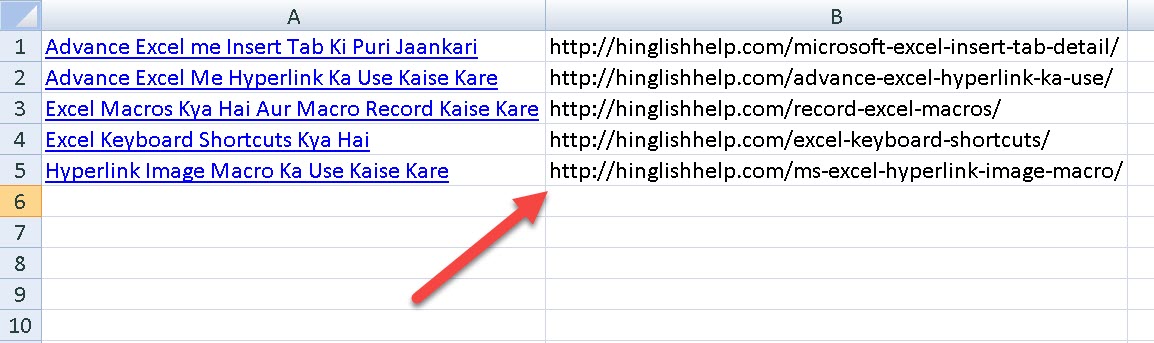 Lijiye hyperlink taxt macro se excel worksheet me available hyperlink text se link extract ho gaye hai. Issi tarah se aap microsoft excel me hyperlink text ki badi se badi list ke links ko seconds me extract kar sakte hai.