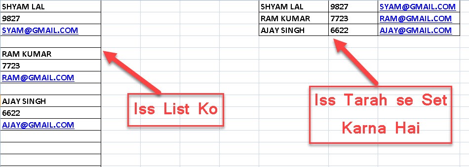 Ab excel worksheet me di gayi list ko manually cut or paste karke row wise set kar lijiye. For example name ke samne contact number aur email id paste kare. Aur beech ki sabhi rows ko one by one karke delete kar dijiye. Formatting complete ho jane ke baad macro recording ko stop kar dijiye.