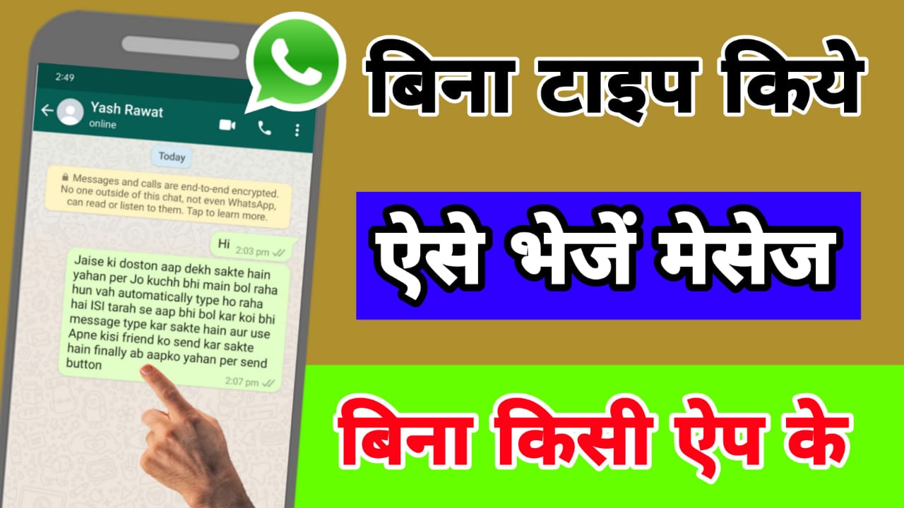 Bina type kiye whatsapp message kaise bheje iss post me mein aapko bataunga, agar aap whatsapp user hai to whatsapp par aap apne friends ko message bhejne ke liye uss friend ki chat open karke message bar me message type karke send karte honge, lekin iss post me jo trick mein aapko batane wala hu iske through keyboard ka use kiye bina bhi koi bhi message apne friend ko bhej sakte hai.