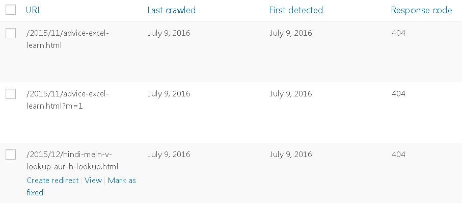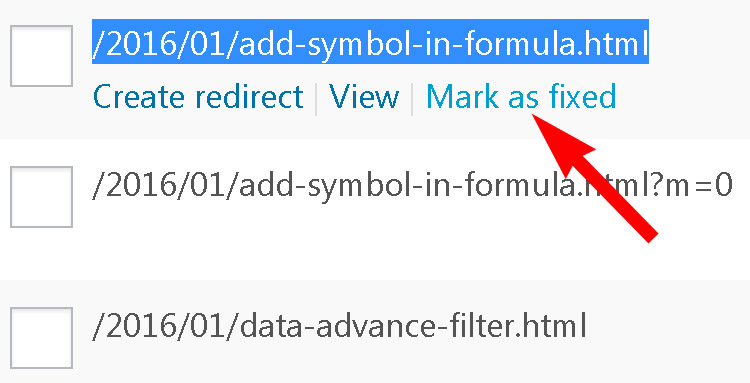 Ab wapas apni 404-error not found list me jaye aur jo link add redirection me submit ho gaya hai usse mark as fix kar dijiye.