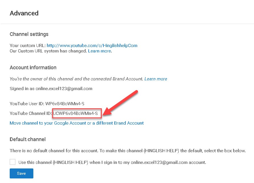 Advance option par click karne ke baad, next page me apni youtube channel id ko copy kare.
